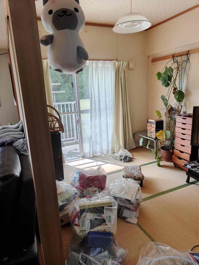 まずはリビング・和室・洋室の3部屋を回り、残す物と処分する物を仕分けました。お母様が趣味で集めていた和食器や手芸用品、アルバムは一時的に保管用ダンボールへ。ご依頼主様にはご希望どおり写真を送付し、LINEでリアルタイムに確認を取っていただきました。