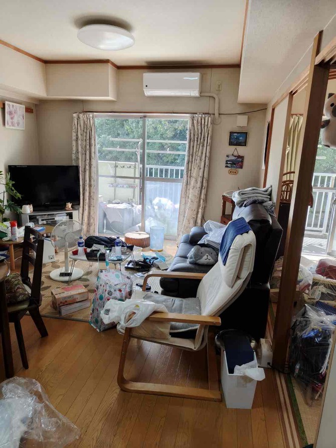 現場は築35年のマンション8階部分、2LDK(約60u)の間取り。お母様が長年暮らされてきたため、家具・家電・衣類・思い出の品が各部屋にびっしりと残っていました。特に和室の押し入れと洋室のクローゼットには、衣類やアルバム、趣味の品が大量に収納されており、仕分け作業に時間を要することが予想されました。